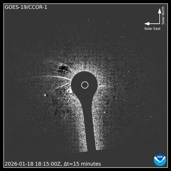 Ejecția de masă coronală (CME) a devenit vizibilă la scurt timp după erupție în imaginile coronografului CCOR-1, prezentând o structură de tip halou, semn clar că va interacționa cu magnetosfera Pământului.