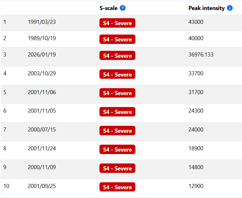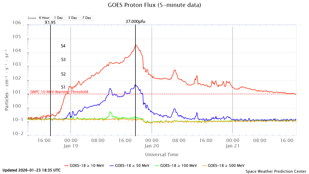 În așteptarea ejecției de masă coronală, un efect secundar al deplasării acesteia prin spațiul interplanetar a fost accelerarea protonilor către Pământ. Astfel, imediat după erupție, nivelul protonilor a crescut constant, atingând pragul unei furtuni de radiații solare de nivel S1 (>10 pfu) la ora 00:45, în data de 19 ianuarie. Creșterea a continuat într-un ritm accelerat până când, în premieră pentru acest ciclu solar, a fost atins nivelul unei furtuni severe de radiații solare S4 (>10.000 pfu).
