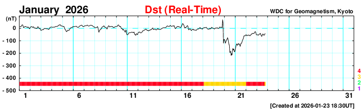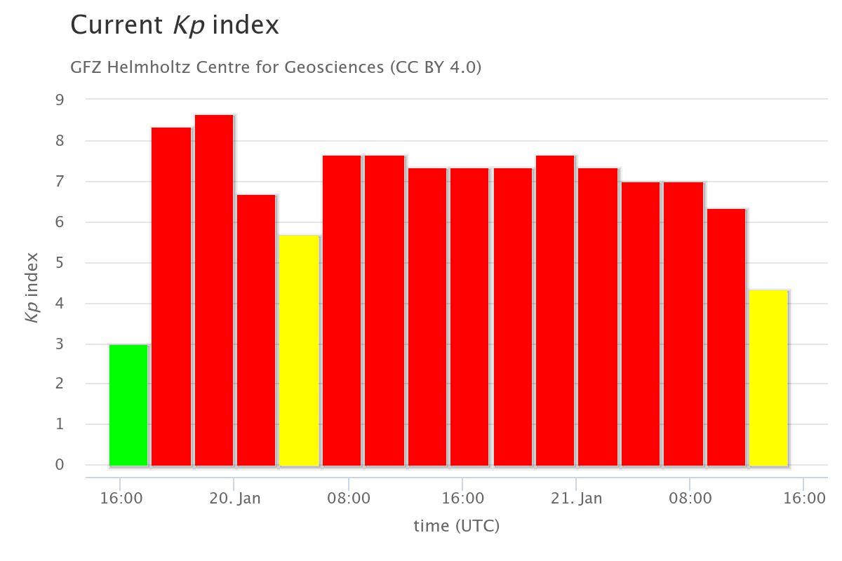 Magnetosfera s-a aflat la valori de furtună geomagnetică timp de aproximativ 42 de ore, indicele Kp menținându-se peste valoarea 5 și atingând un maxim de 8,67 imediat după impact. Durata prelungită a perturbării geomagnetice a permis vizibilitatea aurorei boreale de la nivelul țării noastre timp de două nopți consecutive, 19/20 și 20/21 ianuarie, reprezentând, de asemenea, o premieră pentru acest ciclu solar.