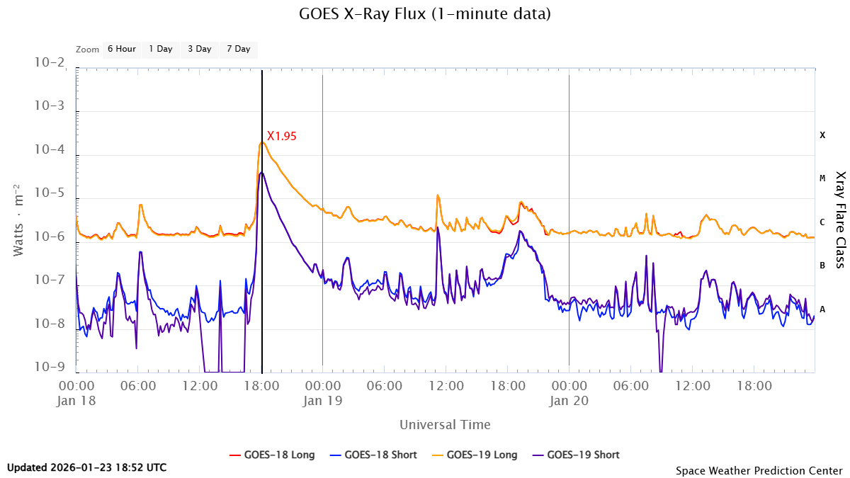 În seara zilei de 18 ianuarie, în jurul orei 20:00 (ora României), complexul de regiuni active AR4341-45, aflat în zona geoefectivă a discului solar, a produs o erupție solară intensă de clasă X (X1.95).