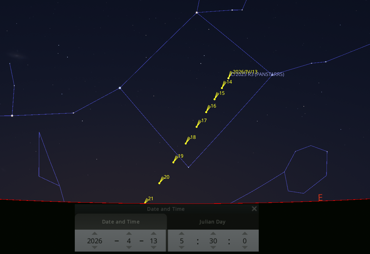 Dar acum este vorba de cometa C/2025 R3 (PANSTARRS), care în următoarele 10 zile se va afla în perioada optimă de observare din emisfera nordică. Aceasta se vede dimineața devreme, înainte de ivirea zorilor, în constelația Pegas, aflându-se chiar în Patrulater. Pe 19 aprilie se va afla la periheliu, distanța cea mai mică de Soare, la 0,5 UA de acesta, iar distanța minimă de Pământ va fi pe 26 aprilie, dar nu va fi vizibilă, fiind prea aproape de Soare aici.