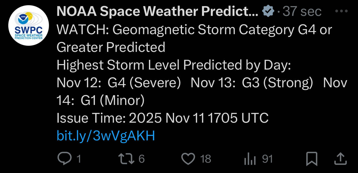 In acest moment exista in vigoare o alerta de furtuni geomagnetice puternice (G3) pentru data de 12 noiembrie ca urmare a sosirii succesive a doua ejectii de masa coronala. Acestea ar urma sa soseasca pe parcursul noptii ce urmeaza. In cazul in care orientarea campului magnetic va fi negativa, sunt sanse bune sa fotografiem aurora din nou din tara noastra, daca cerul va fi senin.