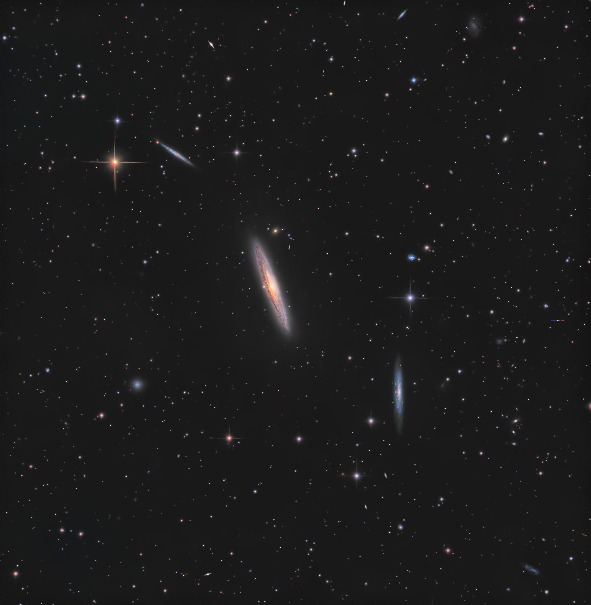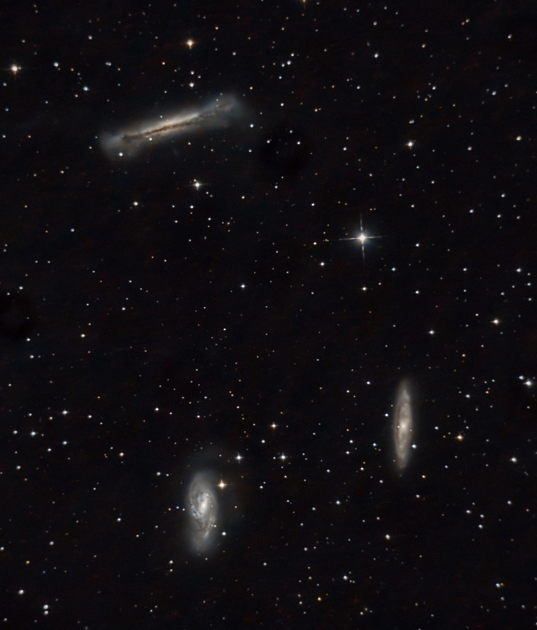 Un alt setup de astrofotografie a fost îndreptat către patria mamă a galaxiilor de primăvară, constelația Virgo. În partea superioară a acestei formațiuni stelare se află o tripletă de galaxii extraordinar de spectaculoasă, cu o particularitate destul de rar întâlnită pe cerul nopții: toate cele trei galaxii componente sunt edge-on, orientate cu muchia spre Pământ. NGC 4216 se află în centrul tripletei, este cea mai mare din punct de vedere al diametrului unghiular, cea mai strălucitoare ca magnitudine aparentă (+10), dar și cea mai apropiată dintre cele trei, aflându-se la 56 milioane de ani-lumină de Fundulea, locul din care a fost fotografiată; NGC 4206, aflată la dreapta de galaxia principală a acestui grup mic de galaxii, are magnitudinea +12.2 și se află la 65 de milioane de ani-lumină distanță. Dacă o civilizație extraterestră inteligentă și ultra dezvoltată din această galaxie ar avea tehnologia de a privi în detalii fine Pământul, ar putea observa live extincția din Cretacic-Paleogen, care a dus la dispariția dinozaurilor non-avieni, punând capăt perioadei Cretacice. În cele din urmă, cel mai îndepărtat reprezentat al acestei triplete este NGC 4222, având o magnitudine de +13.3. Lumina intrinsecă a acestei galaxii a călătorit timp de 83 de milioane de ani pentru a se reflecta de oglinda telescopului colegului nostru, Florin, pentru ca, în final, aceasta să fie captată de senzorul camerei și transformată într-o imagine digitală spectaculoasă.