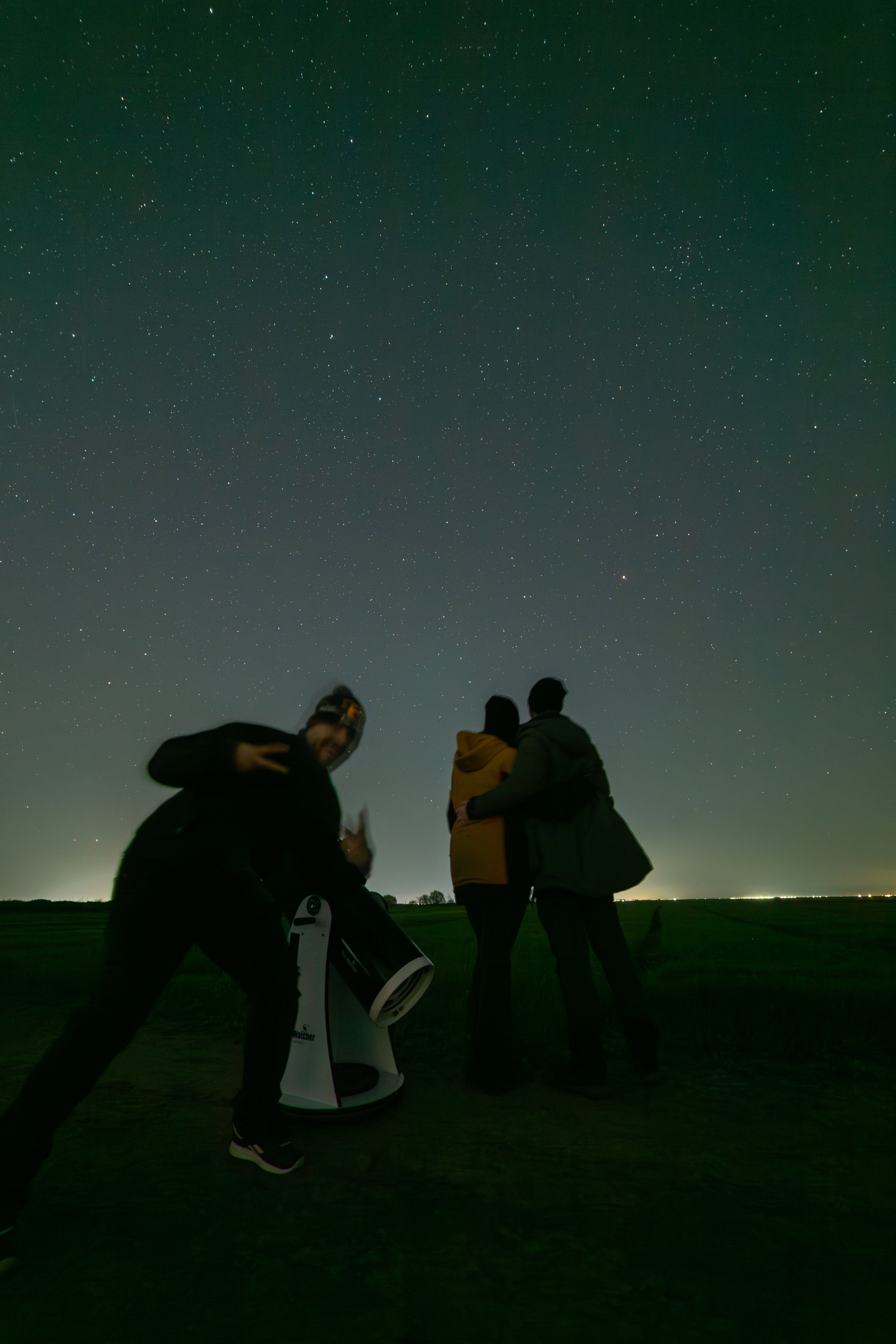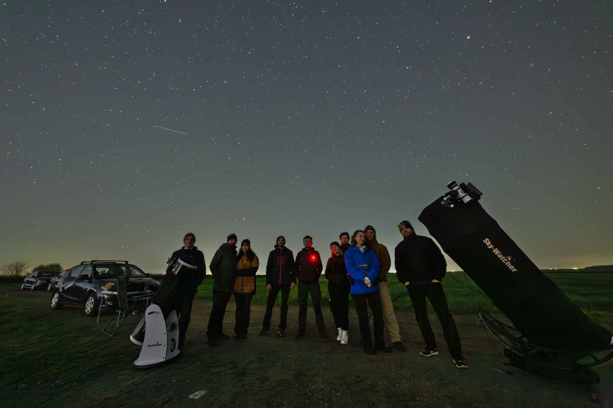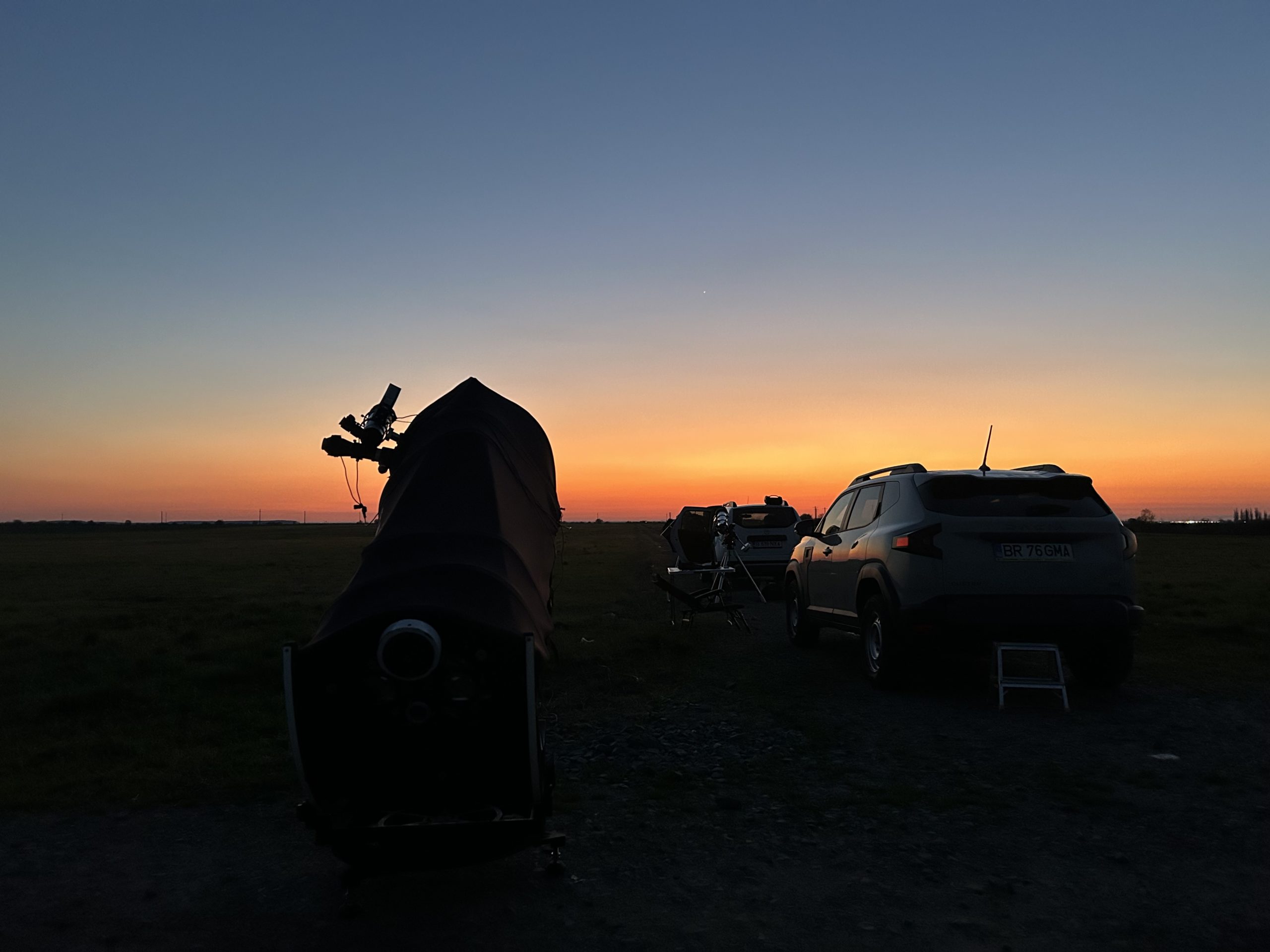 Partea bună este că, deși nopțile sunt din ce în ce mai scurte, avem parte de temperaturi blânde care facilitează sesiunile de observații mai lungi. Cât Soarele se afla pe cer, temperaturile resimțite erau de 20 de grade, fapt ce a permis asamblarea telescoapelor în tricou. Pe măsură ce Soarele apunea, iar noaptea s-a lăsat peste câmpurile agricole, temperaturile au scăzut până la valoarea aproximativă de 10 grade, în continuare cu mult mai bine față de gradele cu minus de până acum.