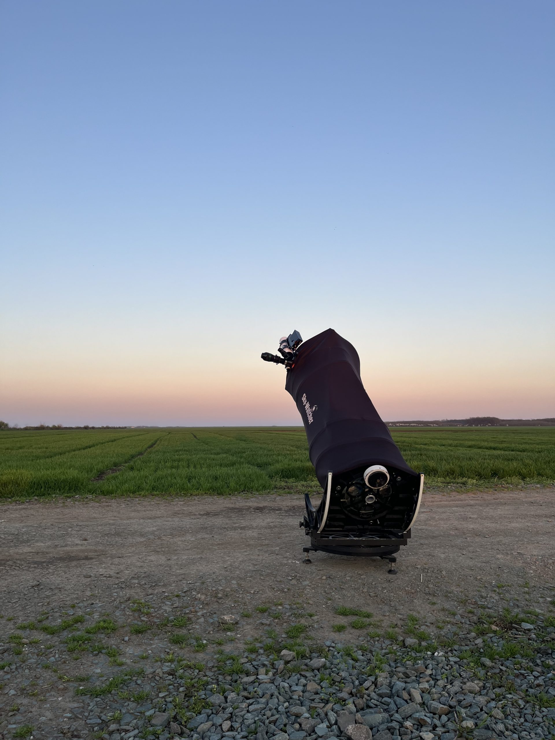 Ca de obicei, în zilele libere, am ajuns la locul de observații cât Soarele se afla încă pe cer, deasupra orizontului vestic, astfel încât să montăm telescoapele pe lumină naturală și să ne asigurăm că totul este pregătit pentru momentul în care ultimii fotoni ai zilei se vor opri din a ilumina cerul. Fiind prima ieșire de la trecerea la ora de vară, am fost nevoiți să așteptăm cu sufletele la gură pe lângă telescoapele montate și deja aclimatizate ca noaptea astronomică să-și intre în drepturi, în jurul orei 21:30. Acest lucru se întâmplă odată cu sfârșitul crepusculului astronomic, când Soarele se află mai jos de -18 grade sub orizont.