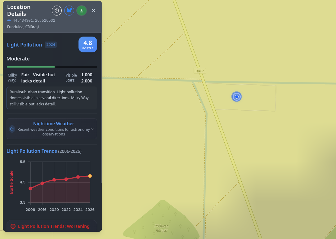 Chiar dacă ne aflăm la peste 20 de kilometri distanță (în linie dreaptă) de București, motiv pentru care ar fi trebuit să beneficiem de o calitate mai bună a cerului (Bortle 4 – „Brighter rural sky” sau Bortle 4.5 – „Semisuburban – Rural Transition”), iluminatul cu led de culoare rece, din ce în ce mai prezent pe meleagurile noastre, deteriorează întunecimea cerului pe zi ce trece.